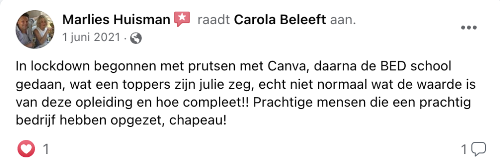 En ik vind het super leuk om het creatieve + organisatorische stuk met het lesgeven te combineren, waardoor ik nu heel veel ondernemers kan helpen in mijn BED-School. (Mijn eigen School die in 2018 is ontstaan! 🙂 )